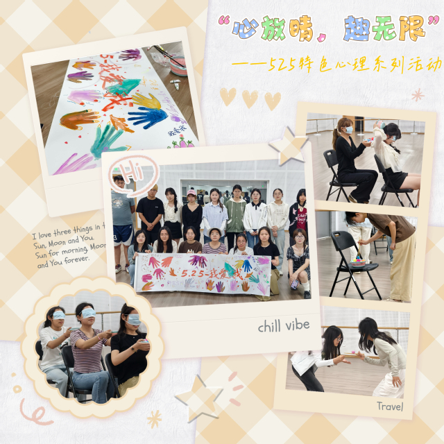 活动现场,气氛热烈。“中译英,猜歌名”环节,小组成员默契配合,在思维碰撞中探寻答案;“筷子运球”考验大家的手眼协调与团队接力,成员们小心翼翼传递,不让消极情绪“小球”留存;“蒙眼传球”里,大家蒙上眼罩,凭借信任与协作完成传递;“纳斯卡手印画”中,同学们尽情发挥创意,用掌印绘制绚丽图景。