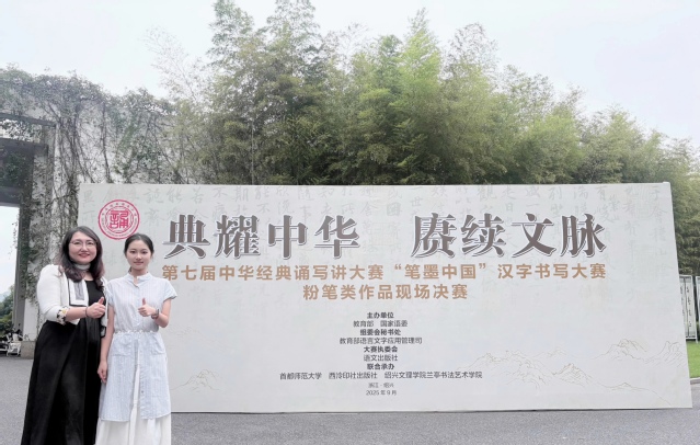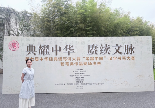 王钰雯同学在李冬香老师的精心指导下,认真制定参赛计划,并接受了多轮针对性辅导,不断锤炼粉笔字的技能技法。经过充分扎实的准备,她作为江苏省师范院校学生组唯一晋级全国决赛的选手,于2025921日前往浙江省绍兴文理学院兰亭书法学院参加现场决赛。比赛中,王钰雯沉着冷静、发挥稳定,凭借扎实的专业功底,最终荣获全国一等奖。