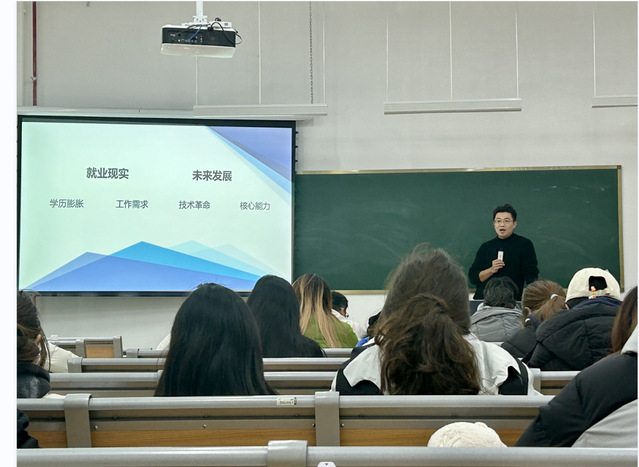 2023年12月6日在求真楼216教室,师范学院邀请江苏师范大学杨彭博士做主题为“就业现实 未来发展”的留学知识讲座,2022级和2023级音乐专业学生及有意愿出国留学的学生聆听了此次讲座。