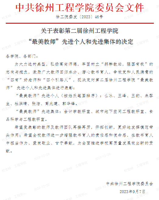 我院朱黎生老师获徐州工程学院“最美教师”先进个人