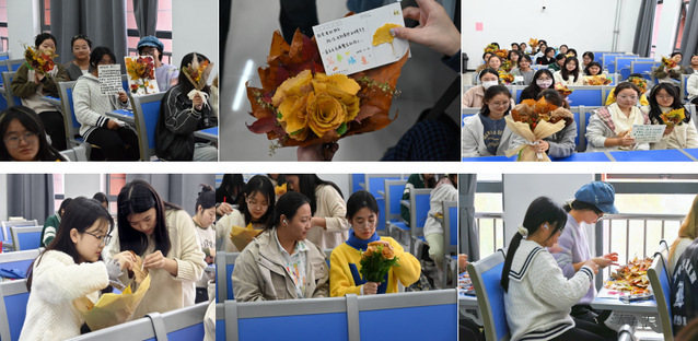 俯身拾起落叶,小心抚平,用心设计与拼接,落叶在巧手下竟奇妙的被转化为花束,并附上了秋日里的所思所感。落叶变成花的这一过程,是心灵与自然的对话,用心完成的花束被交付到珍视之人的手中,更是爱与温暖的传递。学生们通过这一活动编织秋日童话,赋予落叶新生命,同时也为这看似寂寥的秋天增添了一抹暖色。